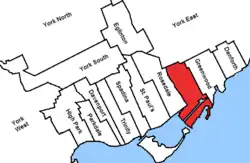 En 1933, la circonscription de Broadview était délimitée par le lac Ontario, la Leslie Avenue, Easter Avenue, Rushbrook Avenue, Queen Street, Jones Avenue, Danforth Avenue, Langord Avenue, la rivière Don et la Toronto Bay.