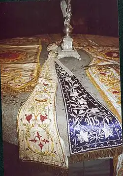 Il existait des fils de différents calibres et de matières variées. Néanmoins, dans les années 1880, une brodeuse d'un grand talent, Anna Poirot[32] qui brodait des ornements d'église, se servait de ses propres cheveux[33],[34] comme fil à broder pour réaliser les cheveux des anges sur ses décors[30].