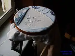 Mais aussi pour travailler sur un métier dit tambour ou rond, monté sur un pied à rotule ou bien sur un métier plat posé sur de légers tréteaux. La luxueuse broderie blanche ne s'exécute jamais sur le doigt mais toujours au métier. Ces métiers sont fabriqués à Fontenoy par d'habiles menuisiers[11].