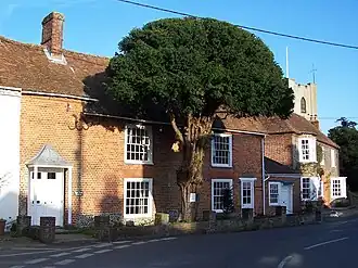 Centre du village, Broughton, Hampshire. Le clocher de l'église est visible à droite.