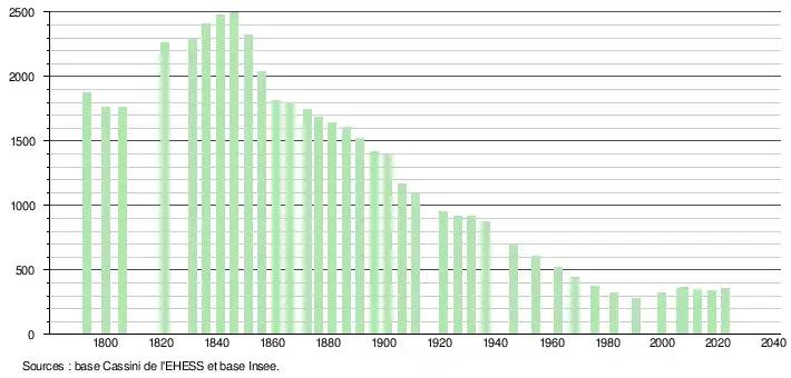 L'évolution du nombre d'habitants est connue à travers les recensements de la population effectués dans la commune depuis 1793. Pour les communes de moins de 10 000 habitants, une enquête de recensement portant sur toute la population est réalisée tous les cinq ans, les populations de référence des années intermédiaires étant quant à elles estimées par interpolation ou extrapolation[16]. Pour la commune, le premier recensement exhaustif entrant dans le cadre du nouveau dispositif a été réalisé en 2007[17].