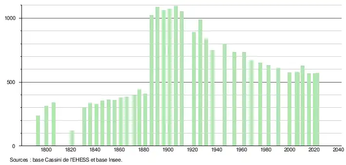 L'évolution du nombre d'habitants est connue à travers les recensements de la population effectués dans la commune depuis 1793. Pour les communes de moins de 10 000 habitants, une enquête de recensement portant sur toute la population est réalisée tous les cinq ans, les populations de référence des années intermédiaires étant quant à elles estimées par interpolation ou extrapolation[36]. Pour la commune, le premier recensement exhaustif entrant dans le cadre du nouveau dispositif a été réalisé en 2005[37].