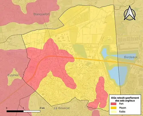 Le retrait-gonflement des sols argileux est susceptible d'engendrer des dommages importants aux bâtiments en cas d’alternance de périodes de sécheresse et de pluie. 97,7 % de la superficie communale est en aléa moyen ou fort (67,4 % au niveau départemental et 48,5 % au niveau national). Sur les 3 891 bâtiments dénombrés sur la commune en 2019, 3 891 sont en aléa moyen ou fort, soit 100 %, à comparer aux 84 % au niveau départemental et 54 % au niveau national. Une cartographie de l'exposition du territoire national au retrait gonflement des sols argileux est disponible sur le site du BRGM[21],[Carte 2].