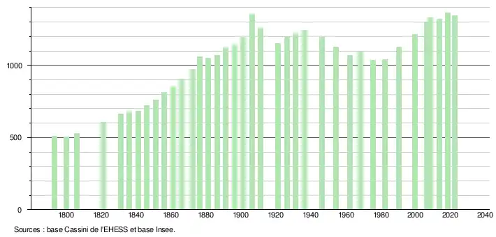 L'évolution du nombre d'habitants est connue à travers les recensements de la population effectués dans la commune depuis 1793. Pour les communes de moins de 10 000 habitants, une enquête de recensement portant sur toute la population est réalisée tous les cinq ans, les populations de référence des années intermédiaires étant quant à elles estimées par interpolation ou extrapolation[28]. Pour la commune, le premier recensement exhaustif entrant dans le cadre du nouveau dispositif a été réalisé en 2008[29].