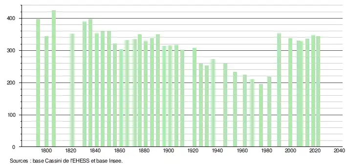 L'évolution du nombre d'habitants est connue à travers les recensements de la population effectués dans la commune depuis 1793. Pour les communes de moins de 10 000 habitants, une enquête de recensement portant sur toute la population est réalisée tous les cinq ans, les populations de référence des années intermédiaires étant quant à elles estimées par interpolation ou extrapolation[28]. Pour la commune, le premier recensement exhaustif entrant dans le cadre du nouveau dispositif a été réalisé en 2008[29].