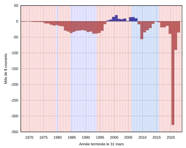 Après un dernier budget excédentaire en 1969-70 le déficit se creuse massivement vers le milieu des années 1970, notamment en 1975-76 alors qu'il triple par rapport à l'année précédente pour atteindre 6 milliards de dollars[1].