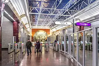Elle dispose en surface, d'un hall d'accès, au rez-de-chaussée d'un immeuble commercial. Situé au nord de la station, il est relié au quai par un tunnel en pente équipé de quatre escaliers mécaniques[2].