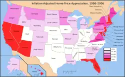 L'augmentation des prix immobiliers n'a pas été uniforme, ce qui a fait dire à certains économistes, dont l'ancien responsable de la Réserve fédérale Alan Greenspan, que les États-Unis ne connaissaient pas en soi une bulle à l'échelle nationale, mais un certain nombre de bulles localisées[53]. Néanmoins, en 2007, Greenspan admit qu'il y avait effectivement une bulle immobilière et que l'ensemble de l'écume formée s'était agglomérée en une bulle unique "[26]. Malgré des politiques accommodantes de prêts et de faibles taux d'intérêt, de nombreuses régions ont subi une hausse très limitée durant la bulle. Sur les 20 plus grandes métropoles suivies par l'indice immobilier S&P/Case-Shiller comme le montre la figure au-dessus, six (Dallas, Cleveland, Détroit, Denver, Atlanta, et Charlotte) ont été l'objet d'une hausse de moins de 10 % ajustée de l'inflation en 2001–2006[54]. Durant la même période, 7 métropoles (Tampa, Miami, San Diego, Los Angeles, Las Vegas, Phoenix, et Washington) se sont appréciées de plus de 80 %. Néanmoins, les bulles immobilières ne sont pas observées toujours au même endroit et à la même époque. Par exemple, à San Diego et à Los Angeles, il a déjà été observé des hausses de prix très importantes durant le boom des années 1990 tandis que les bulles à Las Vegas et à Phoenix ne se sont développées qu'en 2003 et 2004 respectivement.