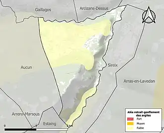 Le retrait-gonflement des sols argileux est susceptible d'engendrer des dommages importants aux bâtiments en cas d’alternance de périodes de sécheresse et de pluie. La totalité de la commune est en aléa faible (44,5 % au niveau départemental et 48,5 % au niveau national). Sur les 123 bâtiments dénombrés sur la commune en 2019, aucun n'est en aléa moyen ou fort, à comparer aux 75 % au niveau départemental et 54 % au niveau national. Une cartographie de l'exposition du territoire national au retrait gonflement des sols argileux est disponible sur le site du BRGM[38],[Carte 3].