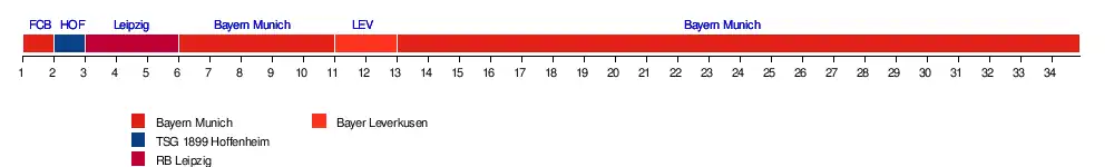 | Leverkusen | 10 | 12 | 14 | 9 | 4 | 4 | 4 | 3 | 3 | 3 | 1 | 1 | 2 | 3 | 3 | 3 | 3 | 3 | 5 | 5 | 5 | 5 | 6 | 5 | 6 | 6 | 6 | 6 | 6 | 6 | 6 | 6 | 6 | 6 | 2 | ||