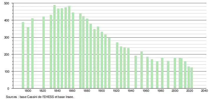 L'évolution du nombre d'habitants est connue à travers les recensements de la population effectués dans la commune depuis 1793. Pour les communes de moins de 10 000 habitants, une enquête de recensement portant sur toute la population est réalisée tous les cinq ans, les populations de référence des années intermédiaires étant quant à elles estimées par interpolation ou extrapolation[16]. Pour la commune, le premier recensement exhaustif entrant dans le cadre du nouveau dispositif a été réalisé en 2008[17].