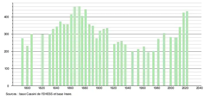 L'évolution du nombre d'habitants est connue à travers les recensements de la population effectués dans la commune depuis 1793. Pour les communes de moins de 10 000 habitants, une enquête de recensement portant sur toute la population est réalisée tous les cinq ans, les populations de référence des années intermédiaires étant quant à elles estimées par interpolation ou extrapolation[17]. Pour la commune, le premier recensement exhaustif entrant dans le cadre du nouveau dispositif a été réalisé en 2007[18].