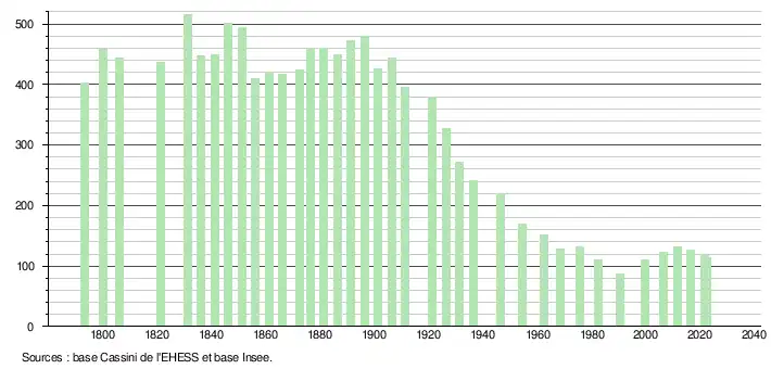 L'évolution du nombre d'habitants est connue à travers les recensements de la population effectués dans la commune depuis 1793. Pour les communes de moins de 10 000 habitants, une enquête de recensement portant sur toute la population est réalisée tous les cinq ans, les populations de référence des années intermédiaires étant quant à elles estimées par interpolation ou extrapolation[23]. Pour la commune, le premier recensement exhaustif entrant dans le cadre du nouveau dispositif a été réalisé en 2006[24].