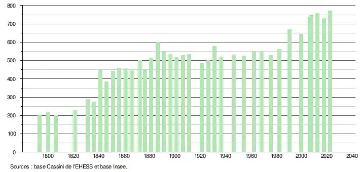 - ↑ Population municipale de référence en vigueur au 1er janvier 2025, millésimée 2022, définie dans les limites territoriales en vigueur au 1er janvier 2024, date de référence statistique : 1er janvier 2022.