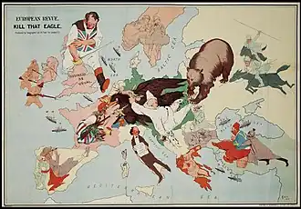 De par sa puissance militaire, son potentiel économique et son étendue territoriale, l'Empire allemand était la plus forte des puissances européennes. Toute volonté d'expansion de sa part entrait alors en opposition avec l'équilibre des forces en Europe. Selon Ludwig Dehio, si l'Allemagne s'était maintenue face à une coalition la plus forte possible, elle aurait obtenu automatiquement une position hégémonique en Europe et dans le monde[44]. En fin de compte, l'Allemagne a prouvé dans la guerre qu'elle était déjà une puissance mondiale, sans quoi elle n'aurait pu combattre aussi longtemps les trois autres puissances mondiales qu'étaient la Russie, le Royaume-Uni et les États-Unis. La volonté d'être une puissance mondiale était plutôt celle d'avoir l'empire colonial le plus étendu possible, donc la volonté de posséder les symboles de ce statut. Le territoire dirigé par l'Allemagne était en effet jugé par les impérialistes allemands comme trop petit en comparaison des autres puissances mondiales, ou ne serait-ce que par rapport à la puissance européenne qu'était la France. L'Allemagne était alors assez forte pour tenter d'être une troisième puissance mondiale aux côtés de la puissance russe et de la puissance anglo-américaine mais pas assez forte pour réussir dans cette entreprise[45]. L'une des raisons de cet échec est l'impossibilité de créer un empire s'étendant de la côte des Flandres jusqu'au lac Peïpous, de la mer Baltique jusqu'à la mer Noire et l'Égée, de l'Heligoland jusqu'à Bagdad, système dans lequel étaient prévues des colonies et des bases militaires avec l'Afrique centrale allemande comme extension de l'Europe centrale. Une telle concentration de pouvoir aurait entraîné des « guerres de libération » contre une hégémonie allemande, comme cela fut le cas lors de la Seconde Guerre mondiale après que l'Allemagne a conquis de grandes parties de l'Europe[46].