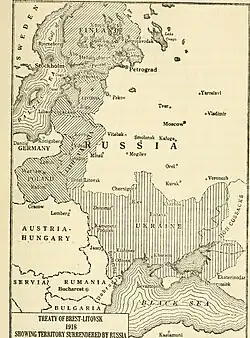 Dans le cadre de la politique des États frontaliers (en allemand Randstaatenpolitik) de l'Allemagne qui consiste à repousser la Russie en créant une zone d'États tampons allant de la Finlande jusqu'à l'Ukraine, le point d'ancrage de la volonté expansionniste allemande à l'est se situe avant tout dans les pays baltes. La majorité des cercles dirigeants en Allemagne, de la droite jusqu'à la gauche anti-tsariste, tient à un concept de division[26]. Le traité de Brest-Litovsk du 3 mars 1918 avec l'Union soviétique prévoit la sécession de la Pologne, de la Lituanie, de l'Estonie et de la Courlande de la Russie, ainsi que l'indépendance de l'Ukraine et de la Finlande. La Russie doit retirer ses troupes de Finlande et de la province de Kars avec les villes de Ardahan, Kars et Batoumi. La Russie perd alors 26 % des territoires sous sa domination, 27 % des terres cultivables, 26 % du réseau de chemins de fer, 33 % de l'industrie textile, 73 % de l'industrie sidérurgique et 75 % des mines de charbon[27].