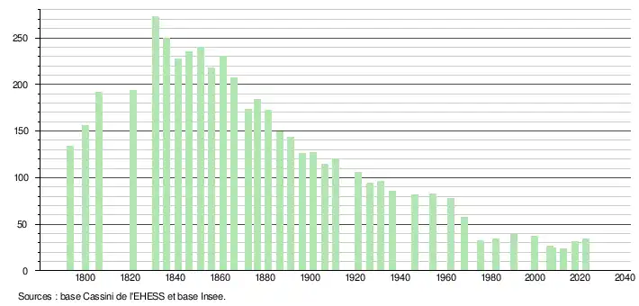 L'évolution du nombre d'habitants est connue à travers les recensements de la population effectués dans la commune depuis 1793. Pour les communes de moins de 10 000 habitants, une enquête de recensement portant sur toute la population est réalisée tous les cinq ans, les populations de référence des années intermédiaires étant quant à elles estimées par interpolation ou extrapolation[14]. Pour la commune, le premier recensement exhaustif entrant dans le cadre du nouveau dispositif a été réalisé en 2007[15].