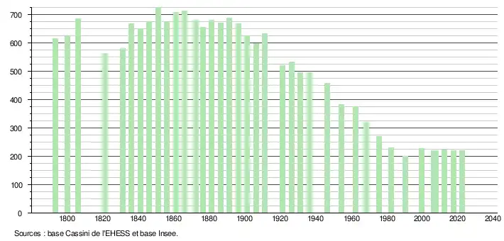 L'évolution du nombre d'habitants est connue à travers les recensements de la population effectués dans la commune depuis 1793. Pour les communes de moins de 10 000 habitants, une enquête de recensement portant sur toute la population est réalisée tous les cinq ans, les populations de référence des années intermédiaires étant quant à elles estimées par interpolation ou extrapolation[31]. Pour la commune, le premier recensement exhaustif entrant dans le cadre du nouveau dispositif a été réalisé en 2007[32].