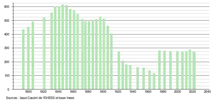L'évolution du nombre d'habitants est connue à travers les recensements de la population effectués dans la commune depuis 1793. Pour les communes de moins de 10 000 habitants, une enquête de recensement portant sur toute la population est réalisée tous les cinq ans, les populations de référence des années intermédiaires étant quant à elles estimées par interpolation ou extrapolation[25]. Pour la commune, le premier recensement exhaustif entrant dans le cadre du nouveau dispositif a été réalisé en 2006[26].