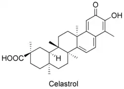 - ↑ « Suppression of inflammatory responses by celastrol, a quinone methide triterpenoid isolated from Celastrus regelii », European Journal of Clinical Investigation, vol. 39, no 9, , p. 819–27 (PMID 19549173, DOI 10.1111/j.1365-2362.2009.02186.x, S2CID 205291261)