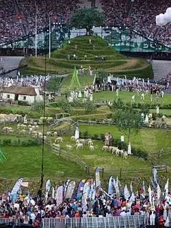 Un paysage bucolique représentant la campagne « verte et plaisante[10] » de la vieille Grande-Bretagne se met en place au centre du stade recouvert de 7 346 m2 de gazon : des villageois jouent au cricket, des paysans conduisent quarante moutons, douze chevaux, trois vaches, deux chèvres, dix poules, dix canards, neuf oies et trois chiens de bergers, et des enfants dansent autour de quatre mâts de cocagne[11].