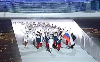 - Parade des nations au cours de laquelle les athlètes représentants de 88 délégations montent sur scène le long d’une rampe spéciale située au centre du stade et mesurant 48 mètres de long. La Grèce, comme le veut la tradition, est la première à entrer et la Russie, la dernière, en tant que pays invitant.