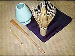- fouet (茶筅, chasen), les fouets à thé sont sculptés dans une seule pièce de bambou. Les vieux chasen abîmés sont simplement jetés. Une fois dans l'année, généralement en mai, ils sont emportés dans les temples locaux et brûlés lors d'une simple cérémonie appelé chasen koyō, qui exprime le respect avec lequel sont traités les objets de la cérémonie du thé.