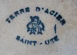 Les pièces sont cuites une première fois à 800 °C, décorées ou non, puis émaillées par trempage et recuites à 1 300 °C. La décoration est uniquement brune jusqu'en 1880. Les célèbres décors imprimés à base de cobalt (bleu)[10] apposés par des tampons de caoutchouc sous émail transparent apparaissent à la fin du XIXe siècle. Appelées bleus de Saint-Uze, ces pièces marquent alors le passage d'une production uniquement utilitaire à une production plus décorative répondant à la demande croissante. Ce sont les pièces les plus fréquemment collectionnées.