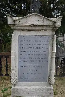 Arrivé dans le faubourg, le colonel Belmont-Briançon est tué net par un coup de feu, alors que le général de Ségur tombe blessé à ses côtés. Les gardes d'honneur ne parviennent pas à chasser les Russes, et il faut attendre les lanciers polonais de la Garde de Krasiński et l'artillerie de Drouot pour récupérer la ville âprement disputée[6]. Le corps du colonel-major des gardes d'honneur est inhumé le lendemain de la bataille dans le cimetière de la Porte Mars, à Reims[1].