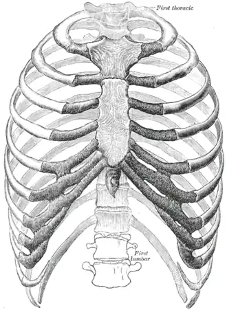 - les sept premières paires, nommées côtes sternales ou vraies côtes, sont reliées directement au sternum par leur cartilage ;