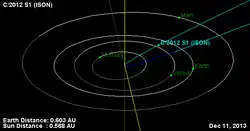 Son orbite presque parabolique suggère qu'elle pourrait être directement issue du nuage d'Oort et n'être jamais entrée dans le Système solaire interne auparavant[10],[11]. La comète est passée à environ 0,07 UA (10 000 000 kilomètres) de Mars le . Le jeudi , lors de son périhélie, elle passa à 1,17 million de kilomètres du Soleil. La majorité des spécialistes avaient estimé qu'il était probable que la comète se désintègre lors de son passage à proximité du Soleil. Malgré le fait que la situation était très incertaine les premiers jours ayant suivi le périhélie[12], les images des jours suivants semblent indiquer que la comète n'existerait plus[13]. Selon certaines estimations, la comète se serait désintégrée peu de temps avant son périhélie, sans qu'il soit pour autant encore possible de dire si la tache brillante visible continuant sur l'orbite de la comète après son approche était constituée simplement de débris ou si un petit noyau issu de l'objet d'origine était toujours là[13]. Quoi qu'il en soit, les images des tout premiers jours de décembre (1-3 décembre) semblent indiquer qu'il n'existe plus aujourd'hui de la comète qu'un nuage de poussière et qu'il est de plus en plus improbable qu'il demeure des morceaux du noyau de la comète[13].