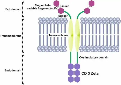 Le récepteur des lymphocytes T (TCR) reconnaît l'antigène ciblé sous la forme d'un court peptide présenté par les molécules du complexe majeur d'histocompatibilité alors que le récepteur des lymphocytes B, comme les anticorps, reconnaît l'antigène natif. Il est possible de produire un récepteur hybride comprenant la partie extracellulaire du récepteur des lymphocytes B fusionnée génétiquement à la partie intracellulaire du récepteur de lymphocytes T. Plus précisément, on fusionne le module de reconnaissance du lymphocyte B (en général sous la forme d'un sc-FV, single chain variable fragment) avec le domaine activateur du lymphocyte T, c'est-à-dire la chaine CD3ζ. Le récepteur ainsi obtenu (CAR de première génération), une fois exprimé dans un lymphocyte T, redirige ce dernier contre des cellules exprimant l'antigène ciblé par le module de reconnaissance[6],[7],[8]. Cependant, la seule reconnaissance de l'antigène par le lymphocyte T ne suffit pas à produire une activation complète, et peut même rendre le lymphocyte T anergique[9]. De fait, les premiers essais cliniques avec des CAR de première génération furent plutôt décevants.