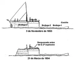 Une heure plus tard, les deux cales de la proue explosent[1], produisant une grande trombe d'eau de plusieurs milliers de tonnes qui entraîne plusieurs personnes à la mer[6]. L'onde expansive se propage dans toute la baie, certains des bâtiments les plus proches s'écroulent et des centaines de fragments de fer sont ejectés à plusieurs kilomètres de distance[1]. La magnitude de l'explosion est telle que selon certains témoignages, un gros bout a atterri sur la commune de Peñacastillo (es), située à 4,7 km de là, tuant une personne[6].Tous ceux qui étaient à bord, parmi lesquels les 32 membres de l'équipage de l'Alfonso XIII et son capitaine, Francisco Jaureguizar, sont morts dans l'explosion.