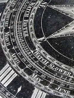 De manière évidente, sur la plaque on peut voir deux échelles graduées qui aident l'observateur à obtenir l'équation du temps. Une échelle donne la date en mois et en jours et tout à côté une autre gravée avec la correction demandée. Il est écrit Watch faster, (Montre en avance)/ Watch slower (Montre en retard). Le est un jour où la montre et le cadran vont de pair[15]. Ce cadran peut être utilisé à la fois pour lire l'heure solaire indiquée par les cadrans solaires et aussi le temps moyen qui est indiqué par les horloges[16], dans le but pratique de mettre les montres de poche à l'heure, qui en 1812 n'étaient pas toujours justes. En 1820, la fabrication des montres s'est améliorée : l'échappement à ancre était devenue universellement adoptée et un étalonnage fréquent n'était plus nécessaire.