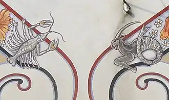 Ce cadran solaire ne présente aucune graduation saisonnière, et si l’on reconnaît évidemment deux signes du Zodiaque, le Cancer et le Capricorne, symbolisant l’été et l’hiver, ils ne peuvent être considérés que comme des éléments décoratifs qui s’intègrent dans une frise octogonale fleurie qui entoure l’ensemble de la fresque.