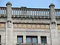 Les trois travées centrales possèdent trois sortes de sgraffites. Sur l'entablement, sous la balustrade couronnant la façade, se logent trois suites de huit sgraffites rectangulaires représentant des fleurs stylisées et séparées par des figures sculptées dans la pierre. Au tympan des trois triplets du deuxième étage, les trois sgraffites centraux sont ornés de ramages stylisés de type Art nouveau de couleur orangée sur fond rouge-brun auxquels répondent trois mosaïques faisant figurer chacun deux paons blancs sur fond brun logés des allèges entre les premier et deuxième étages.