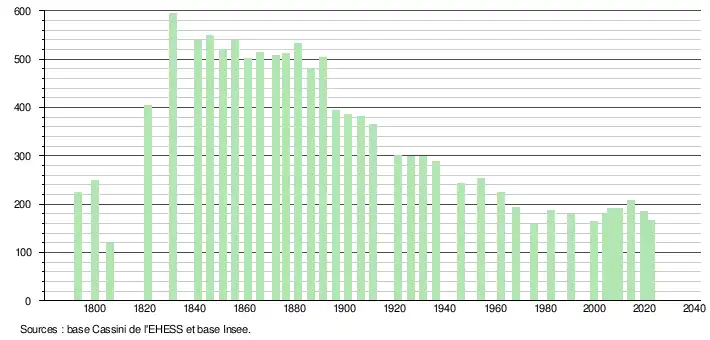 L'évolution du nombre d'habitants est connue à travers les recensements de la population effectués dans la commune depuis 1793. Pour les communes de moins de 10 000 habitants, une enquête de recensement portant sur toute la population est réalisée tous les cinq ans, les populations de référence des années intermédiaires étant quant à elles estimées par interpolation ou extrapolation[23]. Pour la commune, le premier recensement exhaustif entrant dans le cadre du nouveau dispositif a été réalisé en 2004[24].