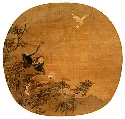 - Sānyuán : au XIe siècle sous la dynastie Song du Nord, les hommes qui terminaient premiers aux trois niveaux des Examens impériaux étaient honorés du titre de « Sanyuan » (三元), signifiant simplement « les Trois premiers ». À la suite de l'apparition de ce terme dans la littérature chinoise, les représentations de trois gibbons poursuivant trois aigrettes apparurent dans la peinture chinoise. En chinois, cette scène pourrait être décrite par « 三猿得鹭 » (san yuan de lu), un calembour sur « 三元得路 » signifiant « un des trois premiers prend du pouvoir ». Rapidement, le gibbon devint un symbole plus général, désignant quelqu'un ayant réussi les examens impériaux, y compris au-delà des premiers rangs. Dès lors, l'image témoigna du vœu que le participant réussisse. Plus tard, les aigrettes furent parfois remplacées par un cerf. En mandarin, le mot « 鹿 » (lù), signifiant « cerf », est homophone de « 鹭 » (lù), signifiant « aigrette », avec un calembour équivalent[18].