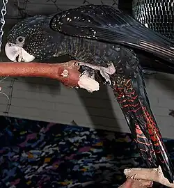 - ↑ Joe Baker, « Rare, unusual, difficult to find:Black Palm Red Tail and Gang-Gang Cockatoos, Blue Napes, Hawk Heads », Birds of Paradise Aviaries, (consulté le ).