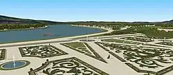 Restitution de la vue sur les parterres du château d'Ombreval (Vimy), à Neuville-sur-Saône, au nord de Lyon, vers 1670.