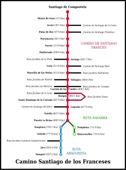 Après Sanche III, de Pampelune, ils suivaient un itinéraire moins direct qui les faisait passer par Puente la Reina, Estella, Logroño, Nájera, Burgos. Ce chemin, stable, sûr et quasiment unique, qui allait de Puente la Reina à Saint-Jacques-de-Compostelle, fut rapidement appelé Iter francorum ou Camino francés, parce que beaucoup de pèlerins venaient du nord des Pyrénées, mais aussi parce beaucoup de Francos, clercs, moines, artisans ou marchands, vinrent s'établir le long de ce chemin qui fut une voie de peuplement plus qu'un chemin de pèlerinage.