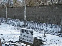 La partie des prisonniers est ceinturée d'un mur de 2,70 m de haut, surmonté de fils électrifiés. Des miradors équipés de mitrailleuses et de projecteurs orientables sont disposés à intervalles réguliers. À deux mètres du mur, côté intérieur du triangle, un chemin de ronde est délimité par une barrière de fil barbelé électrifié. En allant toujours du mur vers l'intérieur, une bande de graviers est ceinturée de chevaux de frises : c'est la « zone neutre ». Dans cette zone, des panneaux indiquent en allemand « On tirera sans sommation », surmonté d'une tête de mort[6].