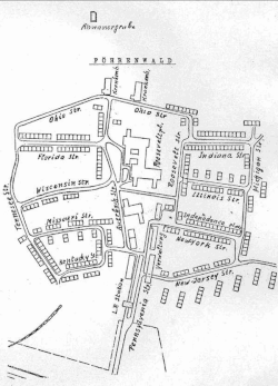 Les bâtiments du camp ont été construits en 1939 par IG Farben pour en faire des logements pour ses employés des usines de munitions qu'elle exploite dans les environs.