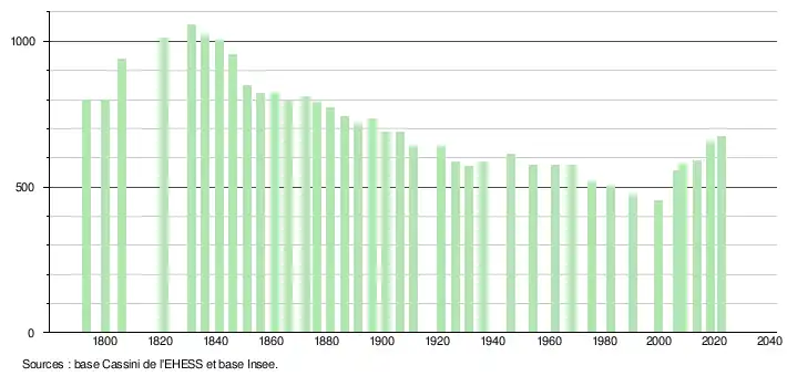 - ↑ Population municipale de référence en vigueur au 1er janvier 2025, millésimée 2022, définie dans les limites territoriales en vigueur au 1er janvier 2024, date de référence statistique : 1er janvier 2022.