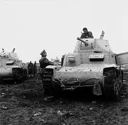 Le , la force italienne avait avancé jusqu'à Maktila, à environ 130 kilomètres à l'ouest de Mersa Matruh, où elle s'est arrêtée en raison de problèmes de ravitaillement[23]. Bien que Mussolini les ait exhortés à poursuivre, Graziani a ordonné à ses hommes de se retrancher autour de Sidi Barrani, et des camps fortifiés ont été établis dans des emplacements avancés ; des troupes supplémentaires ont également été positionnées en arrière de la force principale[24]. En réponse à la dispersion des camps italiens, les Britanniques ont planifié une attaque limitée de cinq jours, l'Opération Compass, pour frapper ces camps fortifiés un par un[25],[26]. La force du Commonwealth britannique, qui comptait 36 000 hommes[27], a attaqué les éléments avancés de l'armée italienne forte de 10 divisions le [28]. Après leur succès initial, les forces de l'opération Compass[29] ont poursuivi les forces italiennes en retraite[30]. En janvier, le petit port de Bardia a été pris[31], suivi de près par la prise du port fortifié de Tobrouk[32].