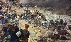 Le , la capitale bosnienne, Sarajevo, qui comptait alors 50 000 habitants, est prise d'assaut, à l'issue d'une bataille de rues, par une armée austro-hongroise appuyée par 52 canons[17],[8]. La veille, Filipović avait arrêté l'ancien gouverneur ottoman de la ville, Hafez Pacha[8]. Le rapport de l'état-major austro-hongrois (en) mentionne que « les petites fenêtres et les nombreux creux dans les toitures ont permis de tirailler dans différentes directions tout en assurant un couvert très efficace », et que « les insurgés se ruaient vers les maisons les plus proches, barricadaient toutes les entrées et engageaient un tir mortel contre l'infanterie d'assaut »[note 1]. La ville est fortement endommagée[24].