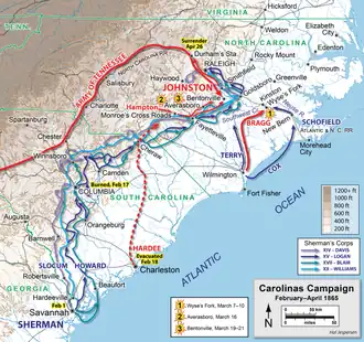 En janvier 1865, le major-général nordiste William Tecumseh Sherman lance son armée vers le nord en partant de Savannah, dont il s'est emparé au mois de décembre précédent, au terme de sa destructrice marche vers la mer à travers la Géorgie. Il traverse les deux Carolines, avec l'intention d'effectuer la jonction avec les forces de l'Union en Virginie. La défaite de l'armée confédérée de Joseph E. Johnston à la bataille de Bentonville en mars, et la reddition de Bennett Place en avril, consacre la perte de la dernière grande force combattante de la Confédération.