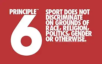 « La jouissance des droits et libertés reconnus dans la présente Charte olympique doit être assurée sans discrimination d’aucune sorte, notamment en raison de la race, la couleur, le sexe, l’orientation sexuelle, la langue, la religion, les opinions politiques ou autres, l’origine nationale ou sociale, la fortune, la naissance ou toute autre situati[2],[3]. »