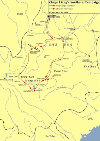 Pendant ce temps, Yong Kai doit faire face à un problème : sa révolte menace de s'éteindre d'elle-même, car après avoir échoué à capturer la Commanderie de Yongchang défendue par Lü Kai et Wang Kang, il s'est tourné vers les tribus Nanman pour obtenir de l'aide. Hélas pour lui, elles ne lui font pas confiance et ne lui apportent pas l'aide dont il a besoin. Pour y remédier, il fait appel à un aristocrate local nommé Meng Huo qui a beaucoup d'influence et de popularité parmi les tribus Nanman. Ce dernier fait le tour de la région, et ment aux gens en leur disant que le tribut qu'ils payent au Shu est disproportionné par rapport à leurs revenus et que le gouvernement du Shu a fait des demandes déraisonnables. Cette campagne de dénigrement du Shu porte ses fruits car, très vite, un sentiment de colère contre le Shu se répand dans la région, et les tribus rejoignent la révolte de Yong Kai[3].