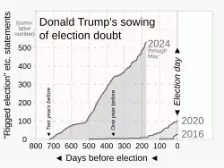 Malgré les tentatives de Trump de renverser l'élection présidentielle de 2020[29],[30] et leur aboutissement dans l'assaut du Capitole des États-Unis du 6 janvier[31],[32], largement décrite comme une tentative de coup d'état[180],[33],[34] ou auto-coup[35],[36] ; Trump affirme que Joe Biden est le « destructeur »[28] et la véritable menace pour la démocratie[181], et répète des affirmations fausses selon lesquelles l'élection de 2020 était truquée et volée, sans aucune preuve à l'appui[28]. Trump a déjà déclaré qu'il avait le pouvoir de « terminer » la Constitution pour annuler sa défaite électorale[182],[183]. Les alliés de Trump auraient rédigé des plans pour utiliser l'Insurrection Act de 1807 afin de déployer l'armée pour fermer les manifestations civiles contre lui dès son premier jour en fonction[4]. Pendant sa campagne de 2024, Trump suggère de briguer un troisième mandat, ce qui fait écho à des commentaires qu'il a déjà faits lors de sa campagne de 2020[184],[185] et pendant son précédent mandat[186],[187].